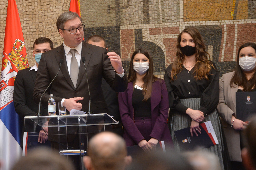 “Желим вам срећу овог света, много од вас очекујемо. Уђите у те узбуркане воде рада, али борите се као до сада и још снажније и сигуран сам да ћете бити успешни, на понос родитеља и свих нас. Желим вам много доброг посла, да будете најбољи, најуспешнији, да Србију никада не напустите”, поручио је председник Вучић.