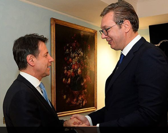Председник Србије Александар Вучић срео се на аеродрому у Риму са италијанским премијером Ђузепом Контеом.