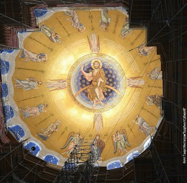 Русија је и уложила новац у осликавање Храма, руски уметници раде на украшавању куполе, а тимове домаћих и руских мајстора предводи руски академик Николај Мухин, главни аутор и творац мозаика.
