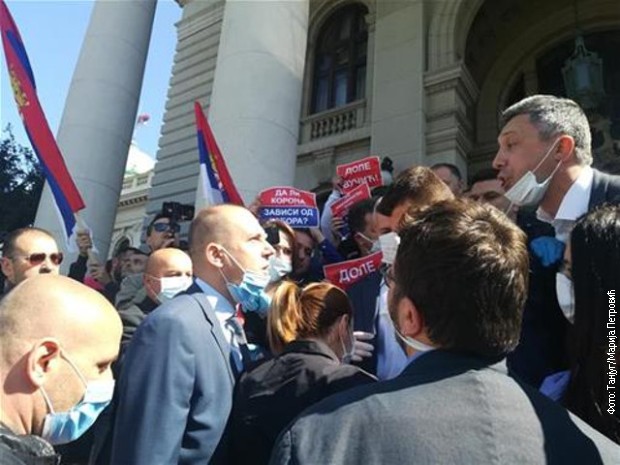 Бошко Обрадовић и присталице Двери држе транспаренте “Доле влада”, “Да ли корона зависи од избора”, “Не може Ђурђевдан, али избори могу”, носе заставе Србије и страначка обележја, и довикују да је председник Србије “издао Косово”.