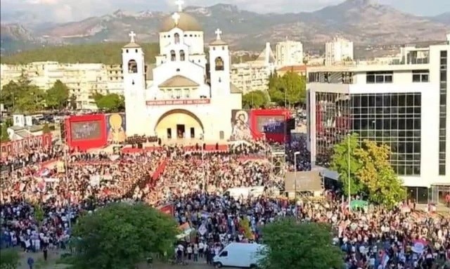 Он је то рекао на платоу испред Храма Христовог Васкрсења у Подгорици, уочи чијег обраћања су окупљени узвикивали “Не дамо Цетиње”.