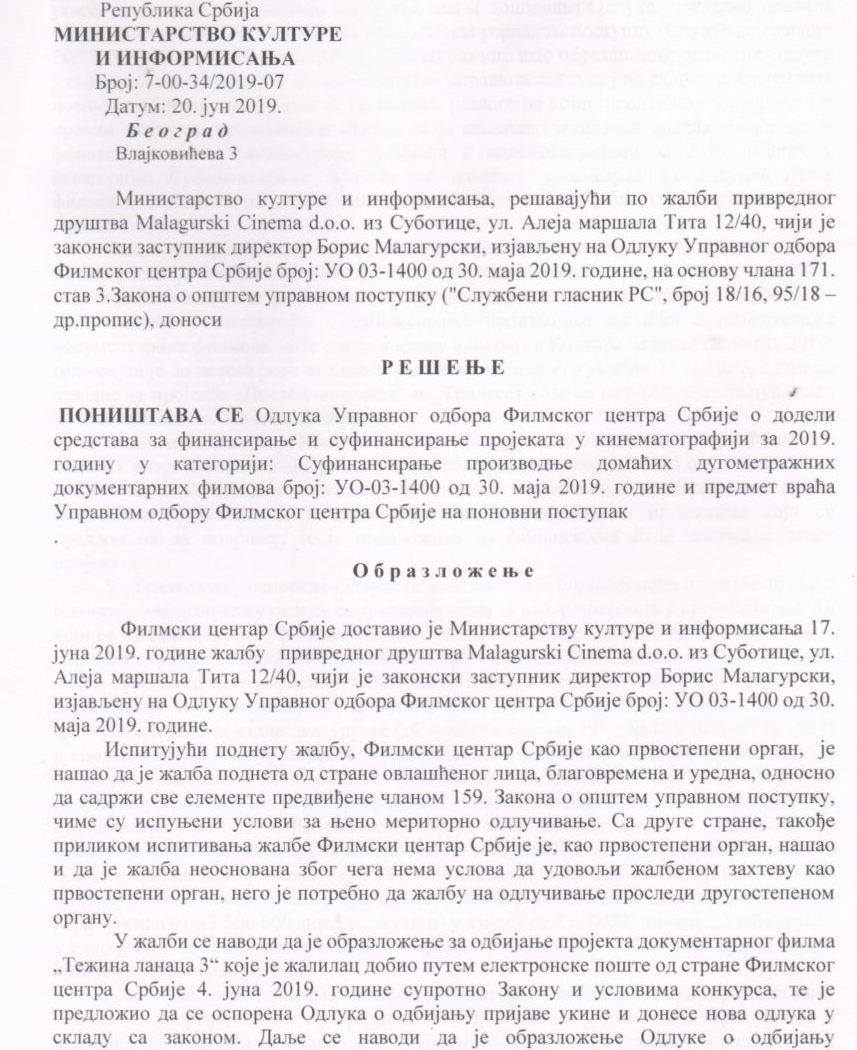 Министарство је у образложењу поништавања одлуке констатовало да је при доношењу одлуке о суфинансирању производње домаћих дугометражних документарних филмова по конкурсу ФЦС од 19. фебруара 2019. Управни одбор Филмског центра Србије повредио Закон о управном поступку, зато што образложења нису адекватна. У образложењу УО ФЦС не виде се јасан правни основ и разлози за одлуку, што представља повреду правила поступка, те је одлука поништена.