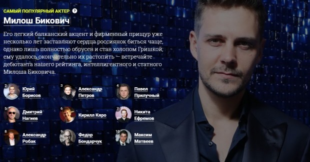 Милош Биковић изабран је за најпопуларнијег глумца у 2020. у Русији, према рангирању сајта kino.mail.ru.