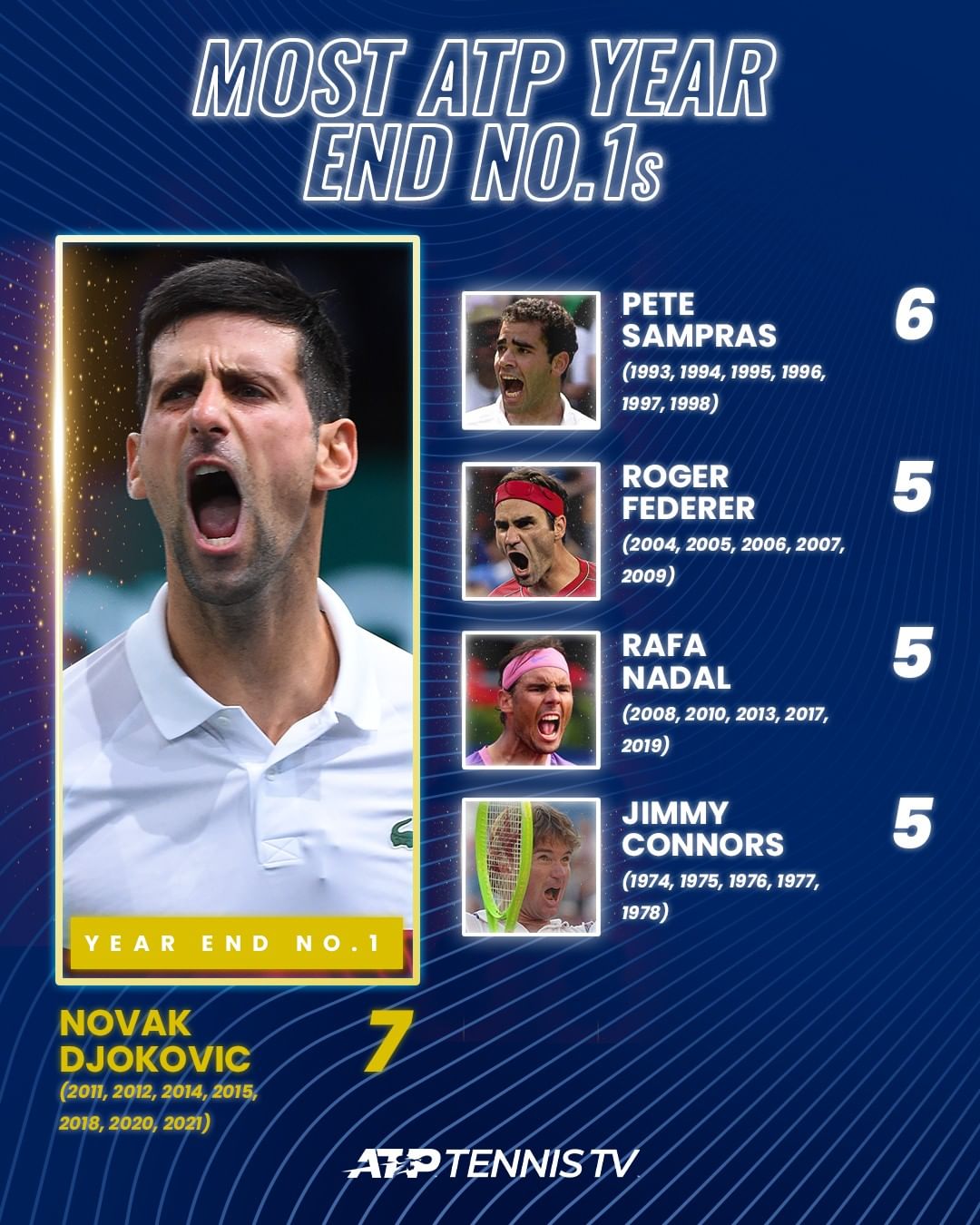 Биће то Нолетов седми пут у каријери да годину завршава на врху светске ранг листе чиме ће поставити нови рекорд који је до данас делио са својим идолом Питом Сампрасом (6).