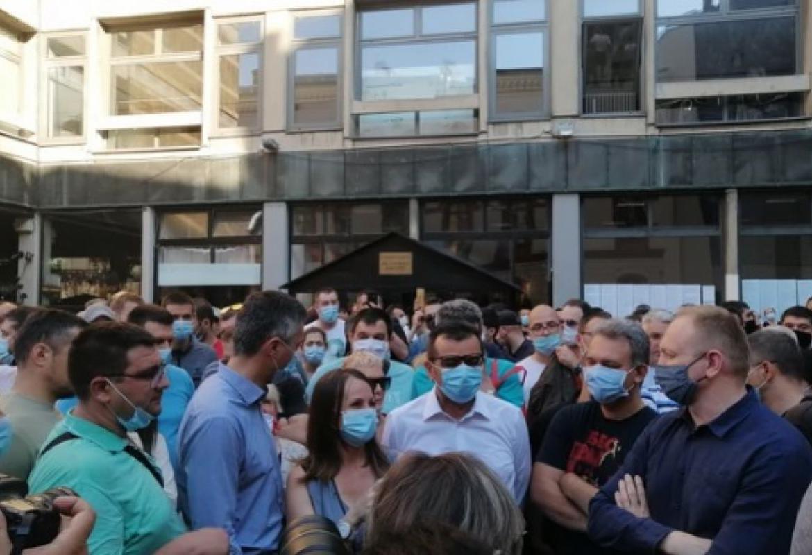 Више стотина Крагујевчана окупило се на платоу код Скупштине града. Тиме су, кажу, пружили подршку грађанима Београда и протестовали због најаве могућности увођења полицијског часа али и због оцене власти да су грађани криви за нагло ширење коронавируса.