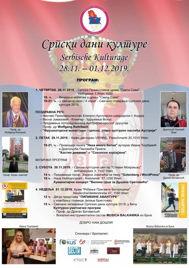 Дани српске културе у Бечу постају традиционални, а организатор Интеграционо и културно удружење “Фокус” посетиоцима ће представити културу и обичаје Србије, са хуманитарним циљем.