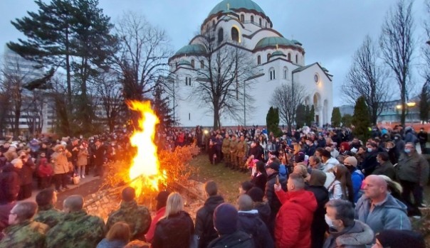 Паљењу бадњака испред Храма Светог Саве присуствовао је велики број верника, међу којима је било доста малишана.