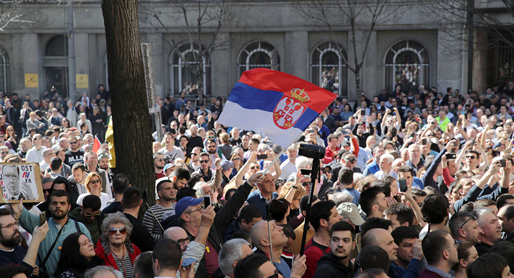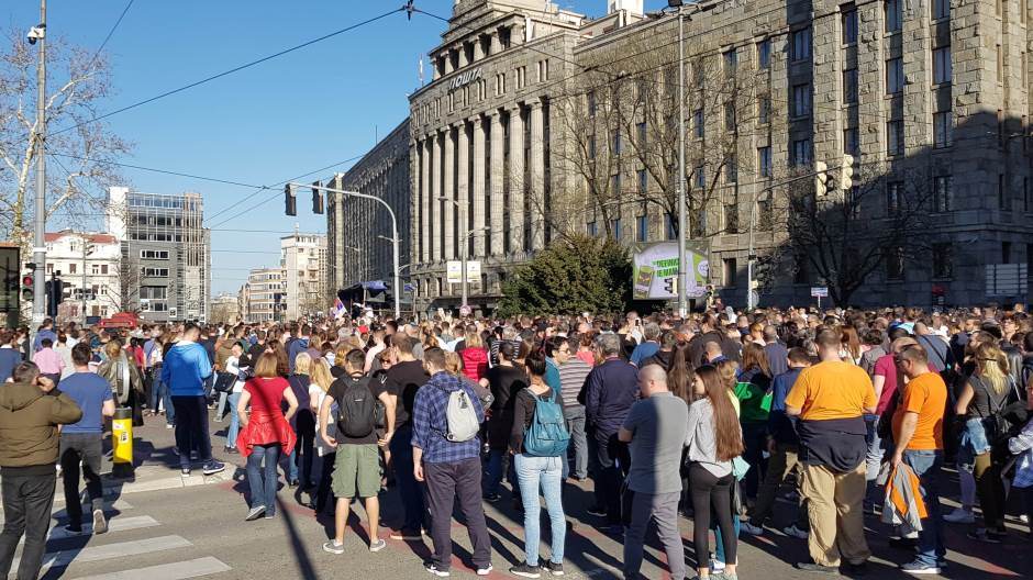 Демонстранти и лидери дела опозиције, који су се окупили у парку испред Председништва Србије током обраћања председника Александра Вучића, су најпре  направили живи обруч око Председништва, захтевајући Вучићеву оставку. МУП саопштава да је група демонстранта предвођена лидером Двери Бошком Обрадовићем улетела у кордон Жандармерије на углу Кнеза Милоша и Српских владара. Демонстранти су потом кренули у протестну шетњу и захтевају ослобађање приведених због упада у зграду РТС-а.