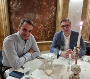 Председник Републике Србије Александар Вучић састао се са председником Владе Републике Грчке Кирјакосом Мицотакисом, са којим је разговарао о билатералним и економским односима, европском путу Србије и ситуацији у региону.