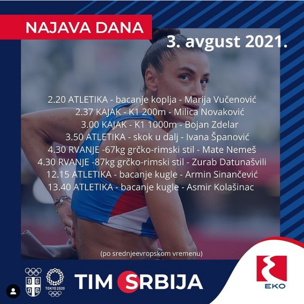 Милица Новаковић и Бојан Зделар ће заузети своје место у тркама у кајака на 200 и 1.000 метара, ту су и бацачи кугле Армин Синанчевић и Асмир Колашинац.