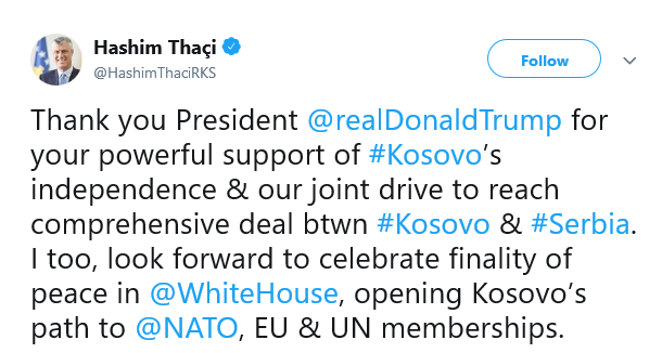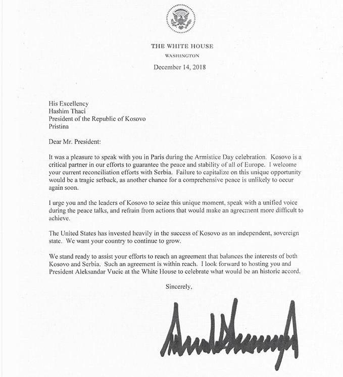 Амерички председник Доналд Трамп је у писму Хашиму Тачију навео да је достизање споразума између Београда и Приштине достижно. Очекујем да Вас и председника Александра Вучића дочекам у Белој кући да бисмо прославили то што ће бити историјски споразум, навео је Трамп.