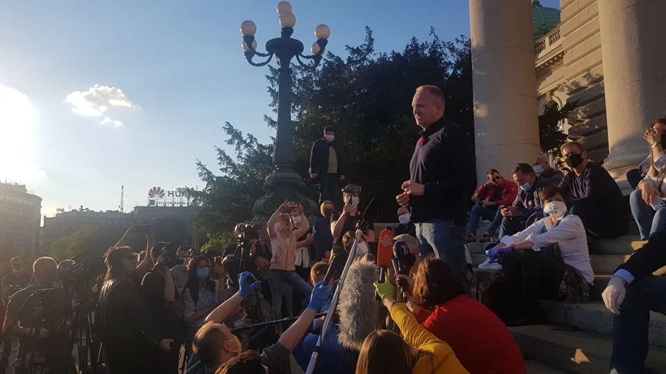 Неколико минута после 18 часова, у време полицијског часа, када је на снагу ступила забрана кретања која ће трајати до суботе у 5 ујутру, лидери дела опозиционих политичких странака окупили су се у знак протеста испред Народне скупштине у Београду. Они су, како тврде, тиме желели да скрену пажњу на незаконит рад Председника Србије, Скупштине и Владе, који су својом вољом незаконито и у супротности са Уставом увели ванредно стање, а такоже да укажу на бесмисао најдужег полицијског часа који је усвојила Влада, а већ наредног дана, примењује потпуно лабаве мере, а све то је како тврде лидери партија у циљу припрема за скоре изборе.