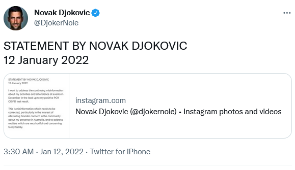 Најбољи тенисер света Новак Ђоковић на друштвеним мрежама објаснио шта се све дешавало и који су разлози проблема које је имао протеклих дана са аустралијским властима. Истакао је да жели да разјасни бројне дезинформације које објављују поједини медији и објасни шта се заиста догађало. Министар за имиграције Хоук неће ни данас донети коначну одлуку о могућој депортацији Ђоковића преносе аустралијски новинари и медији