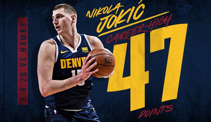 Никола Јокић остварио је рекорд каријере постигавши 47 поена у победи Денвера над Атлантом 123:115. Невероватну партију српски центар допунио је са осам скокова, пет асистенција и две украдене лопте.